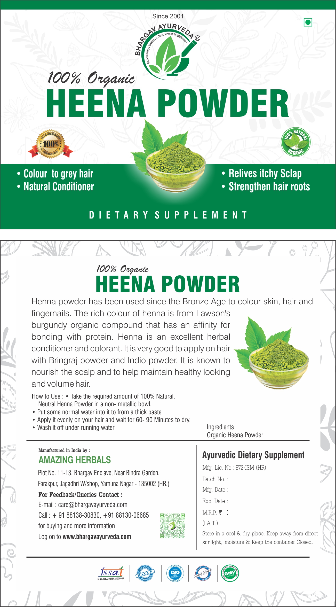 For optimal results, it is recommended to mix Heena Powder with Bringraj Powder and apply it in conjunction with Dr. Bhargav?s Sukun Hair Oil. This combination not only imparts a beautiful color but also strengthens hair roots and alleviates an itchy scalp, promoting overall hair health./n/n