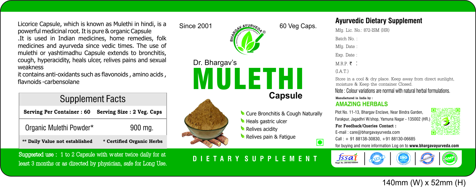 Dr. Bhargav?s Mulethi Capsule is a natural and organic solution known for its potent medicinal properties. Used in Indian medicine, Ayurveda, and home remedies since ancient times, Mulethi (Licorice) provides digestive support, relieves bronchitis, cough, and hyperacidity, and heals gastric ulcers. It also helps with pain relief and fatigue. This capsule balances Pitta and Vata, making it effective in managing high cholesterol, reducing the risk of plaque formation, and supporting overall cardiovascular health. Mulethi also aids in fighting infections by boosting immunity with its Rasayana (rejuvenating) properties. Its anti-inflammatory nature makes it useful for managing conditions like rheumatoid arthritis. Additionally, it can help improve energy levels, skin texture, and color. /n/n